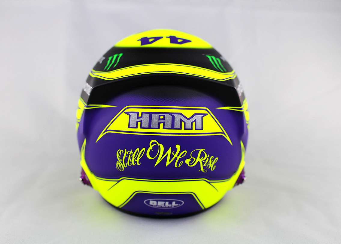 Lewis Hamilton 2022-es bukósisakja, melyben sorozatban a 9. szezonját tölti a Mercedes AMG Petronas istállónál. A sisak felülete mattos, felnyitható sisakrostély, lila színű Bell csavarokkal.