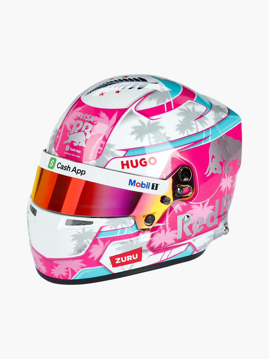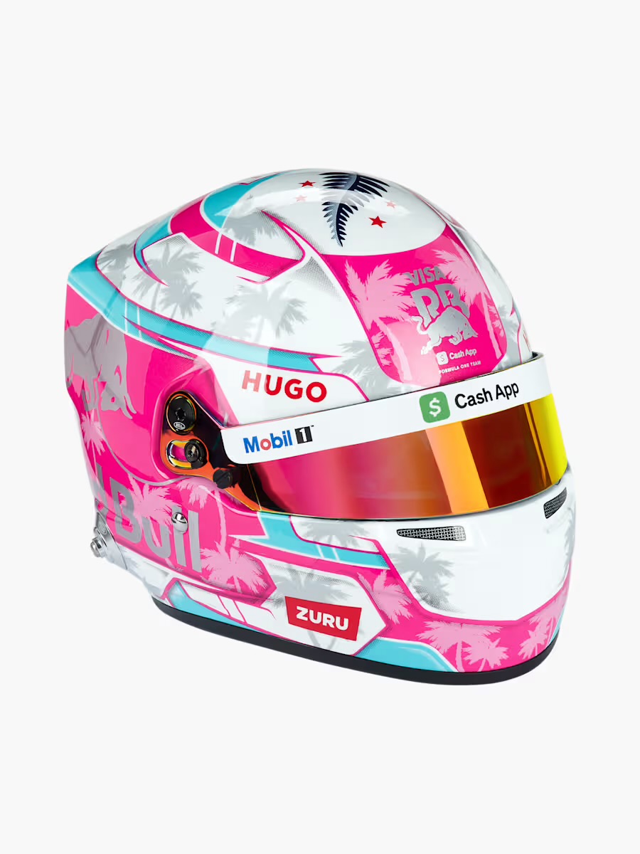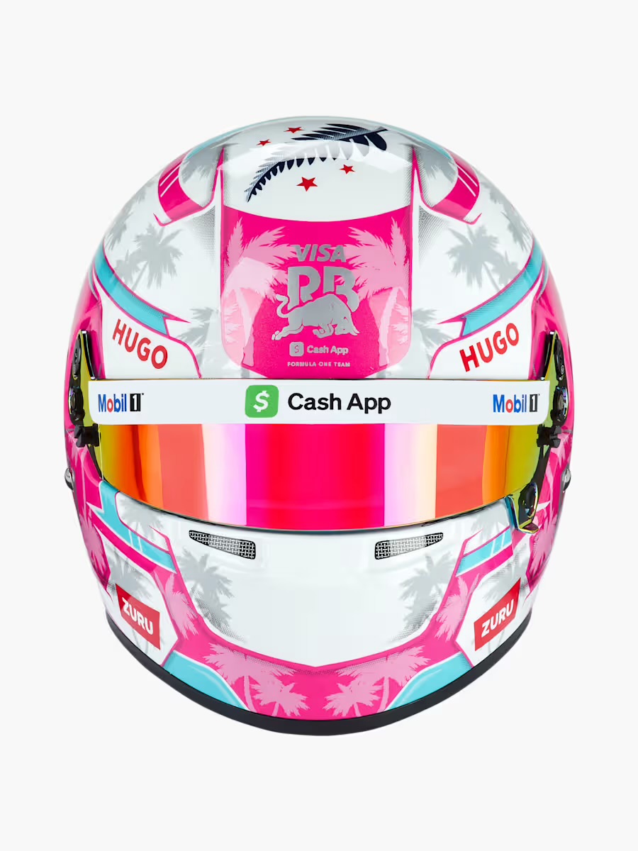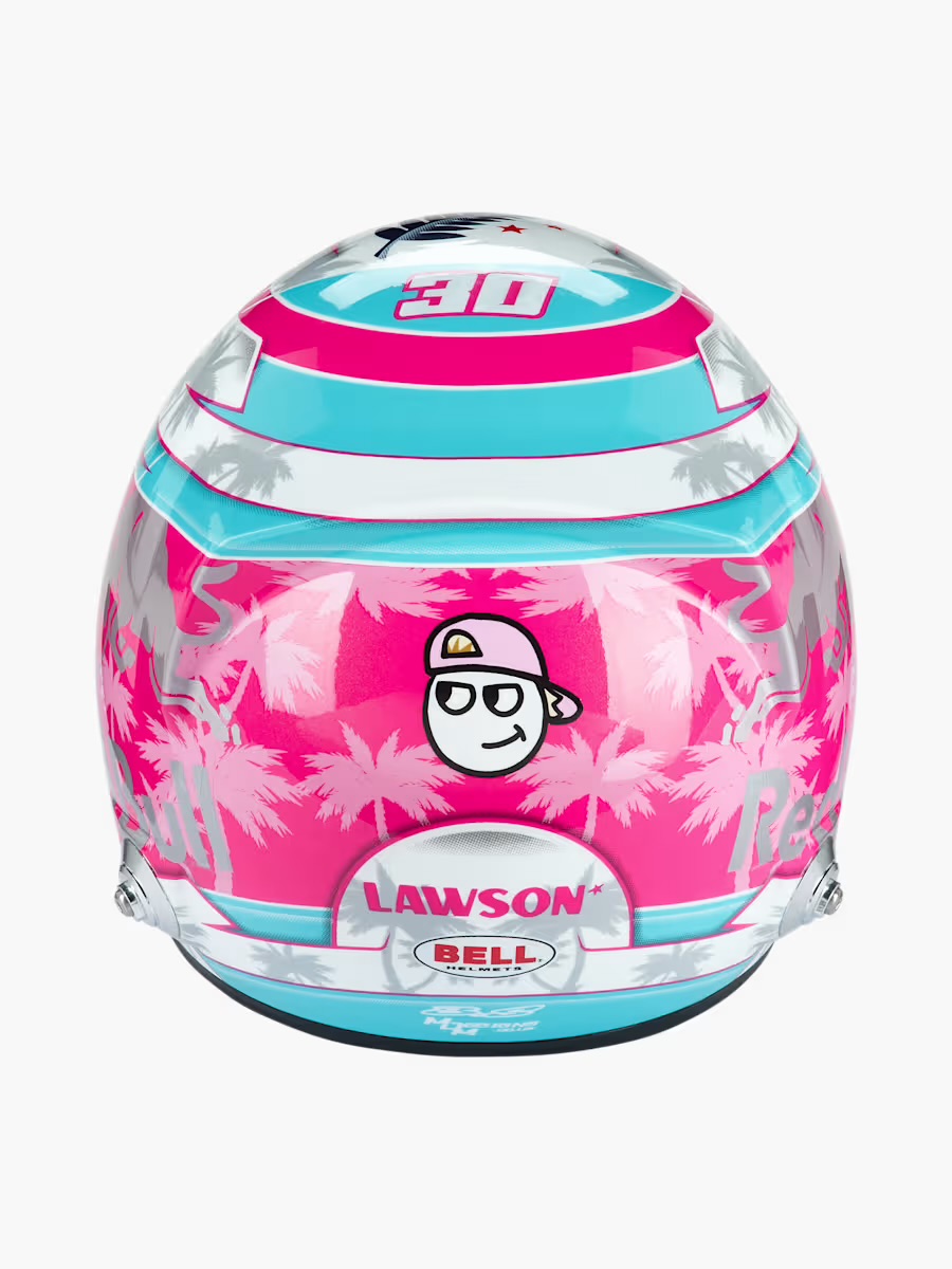 A 2025-ös Miami Nagydíj alatt Liam Lawson a város ünnepi hangulatát hozta el közvetlenül a sisakjába, egy olyan dizájnnal, amely megragadja Florida vibráló lényegét. Ez a különleges kiadás a pink, fehér és világoskék árnyalatokat ötvözi stilizált pálmafákkal , amelyek Miami tengerparti, trópusi hangulatát idézik.